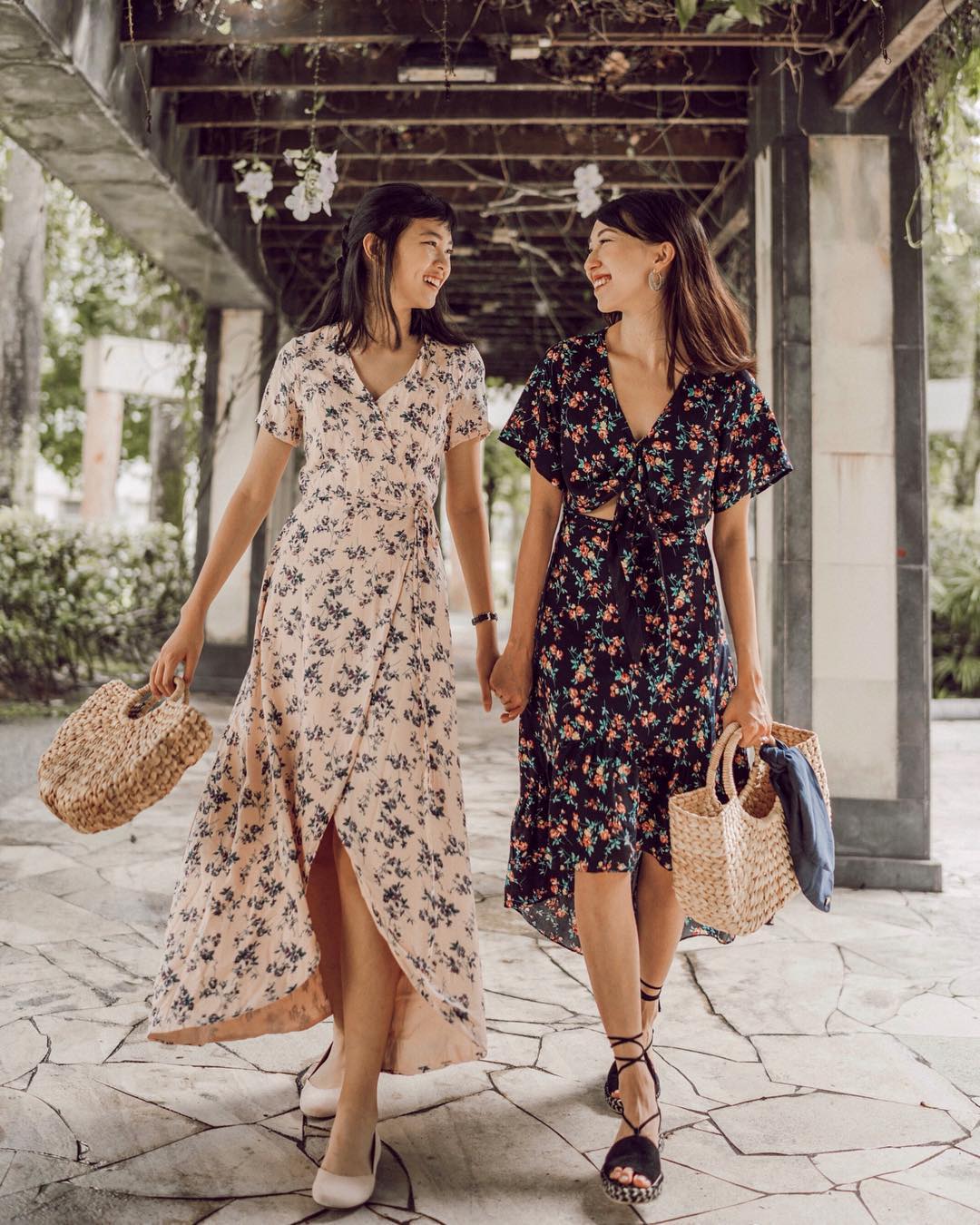 There is no better way and time to wear floral print than during the hot summer days. Floral print on a long dress brings a unique modern vibe and a feminine touch. This look by Melissa (IG @melissackoh) and her sister is showing us how so. Although these two outfits might look the same from afar, they are essentially different. The dress on the left is a wrap floral dress with short sleeves and V-neck. It has a fish-tail end that is almost floor-length. The dress on the right is a modern version of a top-and-skirt dress, with some opening at the front. It also has a V-neck, but is a shorter version than the previous one. Both dresses require flats or sandals as a footwear to complement the sweet and feminine look. Here are some products which can help you achieve a similar look.