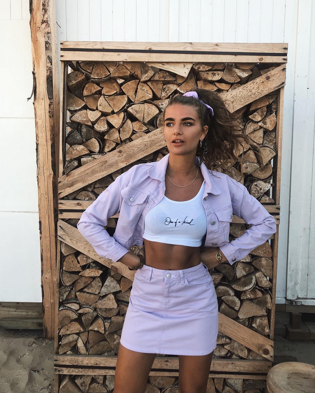 Pale lilac is the kind of colour that looks good in summer, especially against the hot summer tan. Usually, this colour comes in more basic fashion pieces and coats. This look by Salome (IG @salome), however, shows something totally different. The mini skirt and the cropped jacket in lilac denim make an exquisite combination. The soft denim material is cool for the summer. Underneath the jacket is an ultra-cropped cotton top that is easy to wear and appropriate for summer. If you are in doubt with the lilac shade, you can always go with baby pink instead. Here are some similar products which can help you achieve this look.