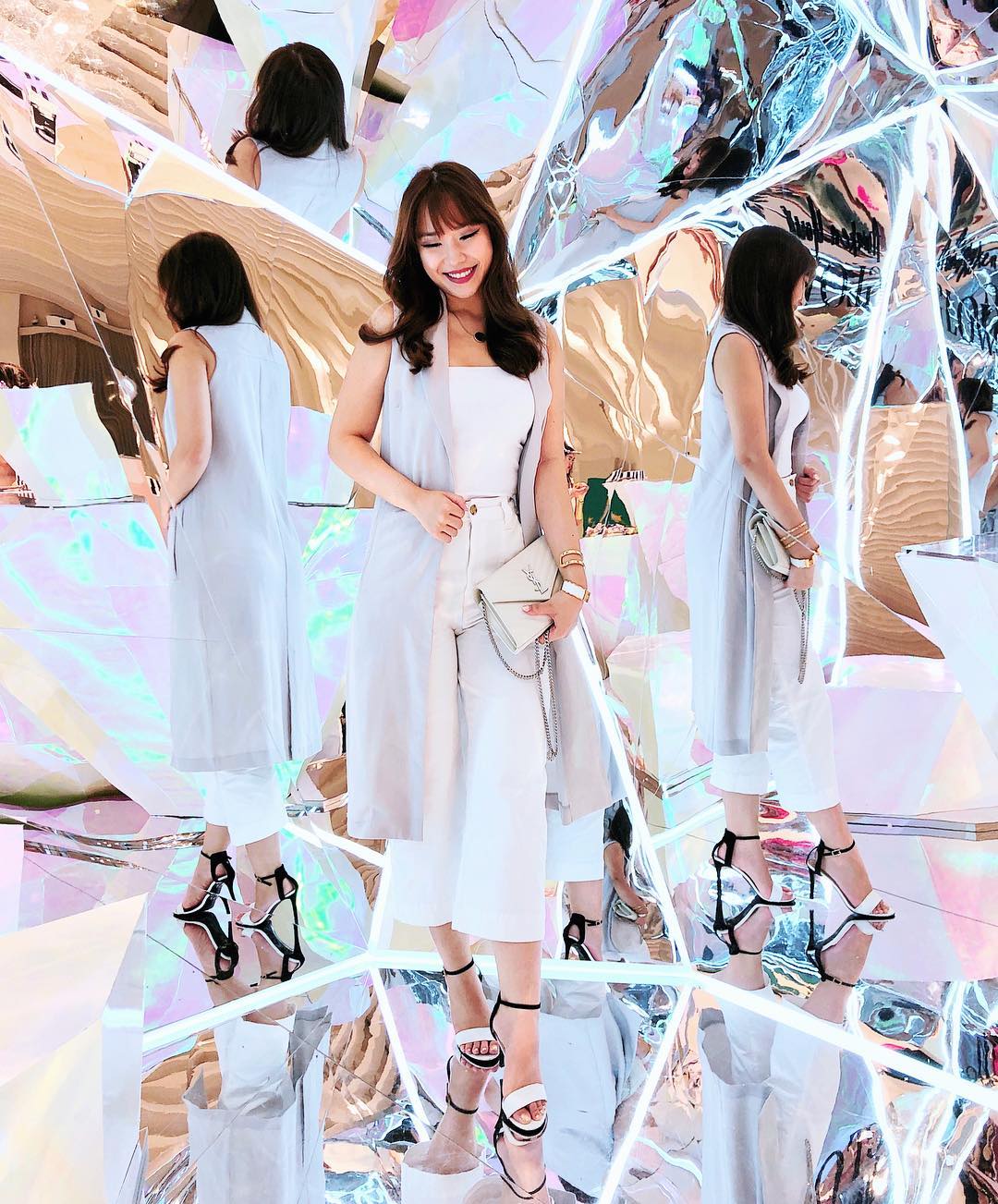 A full white-on-white look is something that can easily be achieved if you have right fashion pieces. White is a very popular colour for summer. It is neutral, clean, elegant and perfect for both day and night outfit. This all-white look by Jessica (IG @shiberty) consists of three fashion items. The pants are wide with below-the-knee length – this cutting is very popular this summer. The top is basic, sleeveless and goes well with the pants. Over the pants and the top, the long vest completes this whole look. It is sleeveless, fashionable and easy to mix and match. This whole look asks for a simple yet chic summer footwear, such as this monochromatic pair of heeled sandals. Here are some similar products which can help you achieve this look.