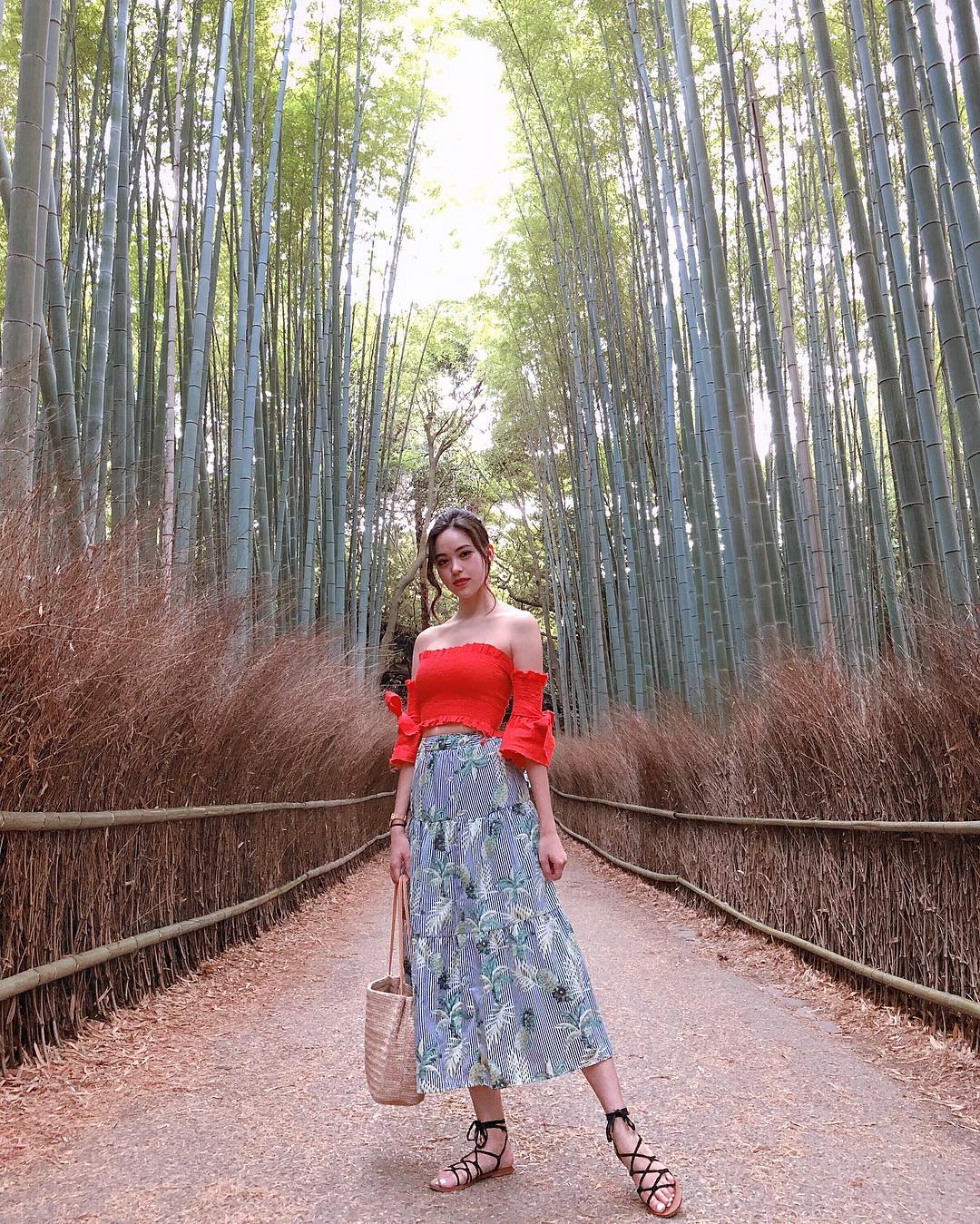 This look is all about achieving the bohemian chic look with a modern contrast, showcased here by Sophie Willocq (IG: @sophiewillocq). Drawing on the features of boho chic in the ‘60s, like the tiered floral skirt and straw tote, and pairing it with a contemporary element like a bright red off-shoulder crop top, the outfit is transformed into one that is relevant for the modern woman while still maintaining a demure feel. The gladiator sandals retain the overall casual vibe of the look, certainly perfect for a stroll in the park.
