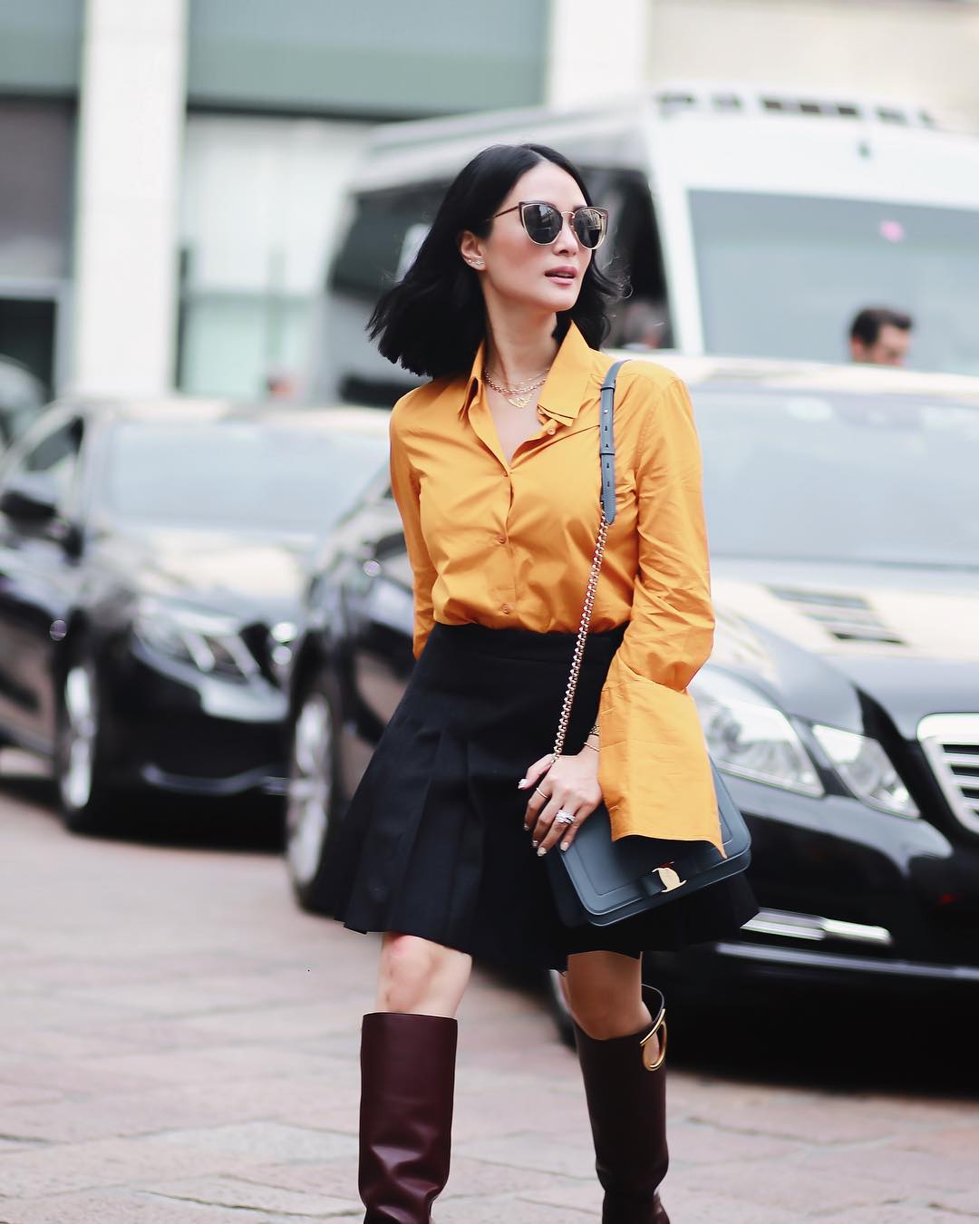 Her look exudes the confidence she has, especially with donning a yellow-coloured top that other girls who are afraid to experiment would shy from. On top of that, her red boots are just what we needed to inspire us to up our A-game in this season filled with boots and sweaters. Others would be satisfied with wearing the good old leather black boots, but not this Fashion icon. What seems to be simple, she wants to enhance and make unforgettable!