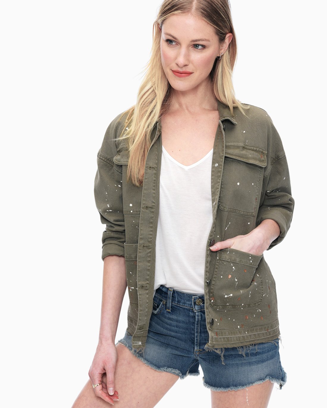 With a chic frayed hem and a delicate splattered paint motif, these Long Cargo Jacket adds an artful appeal to your ensemble.