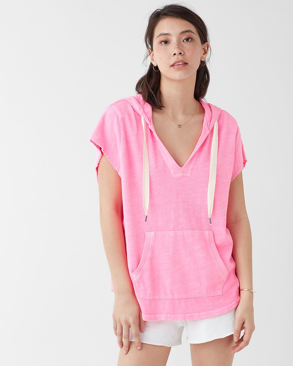 Cut for a full fit with a hood and adjustable drawstrings. The open neckline and frayed sleeve edge further add to this style’s relaxed vibe.