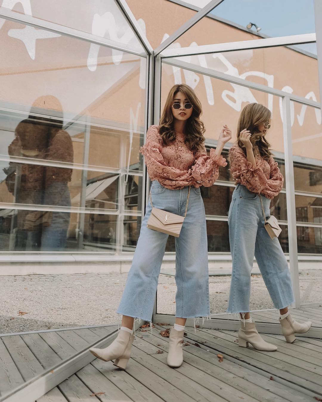 Wide-legged jeans are definitely in! This pair of jeans are super comfortable, so you will have no problem wearing this when you are out and about. Plus, the neutral design matches well with your pink lace top!