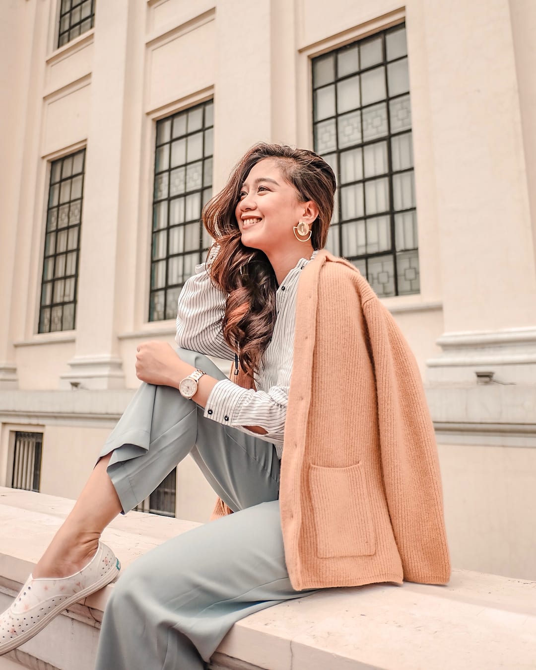She cleverly combined long sleeves, grey trousers, feminine sneakers, and a peach cardigan to wrap up her overall look. It can be tricky to look stylish yet remain casual, yet she did effortlessly here.
