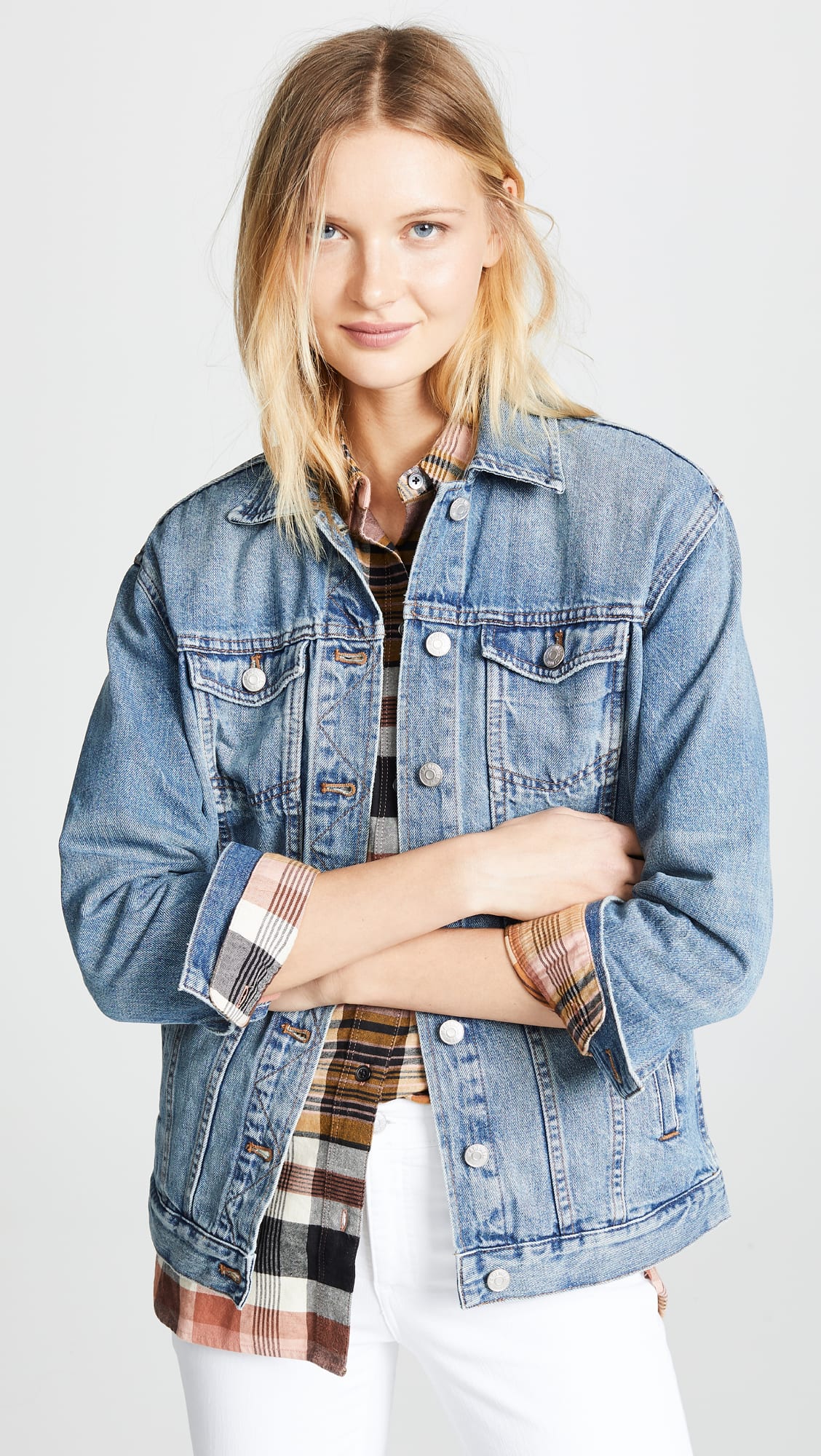 To pull off the off-shoulder (no pun intended) look, go with a denim jacket that is a tad oversized. To add some interest to plain denim, pin on an accessory and you’ll have a unique look to remember.